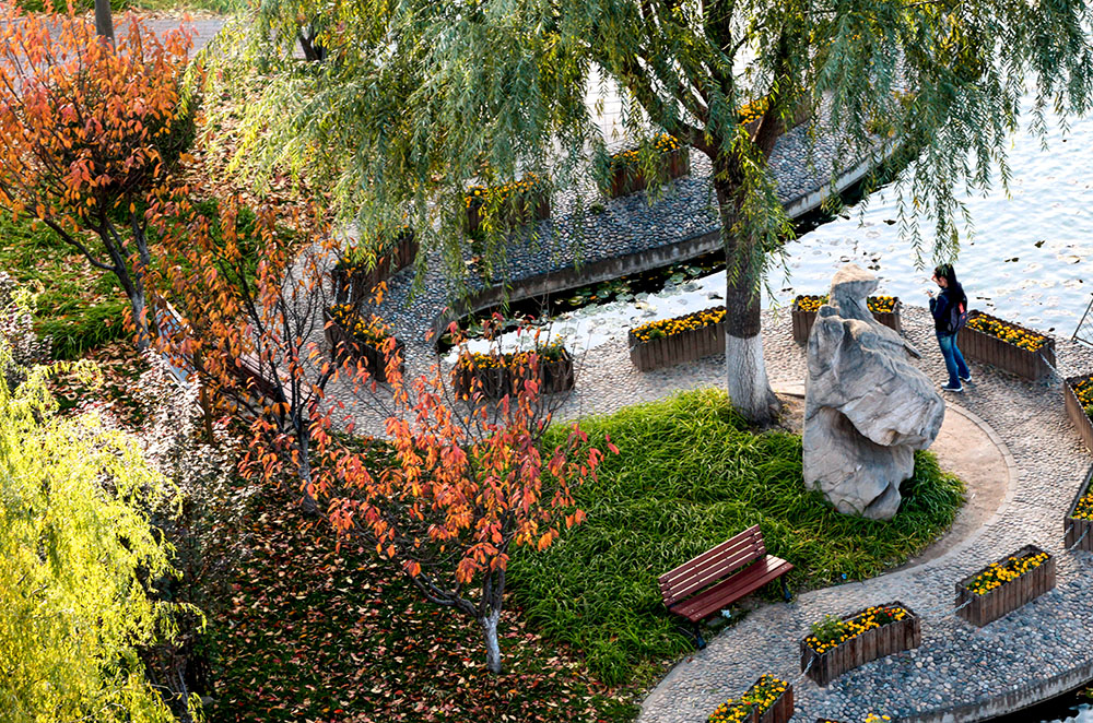 突然想起图书馆门口的“银杏大道”,应该是“秋”味儿最浓了吧,便加紧了步子,往北走,转过曦池,看雁灰羽,叶深红,夕阳西照,一池波光。